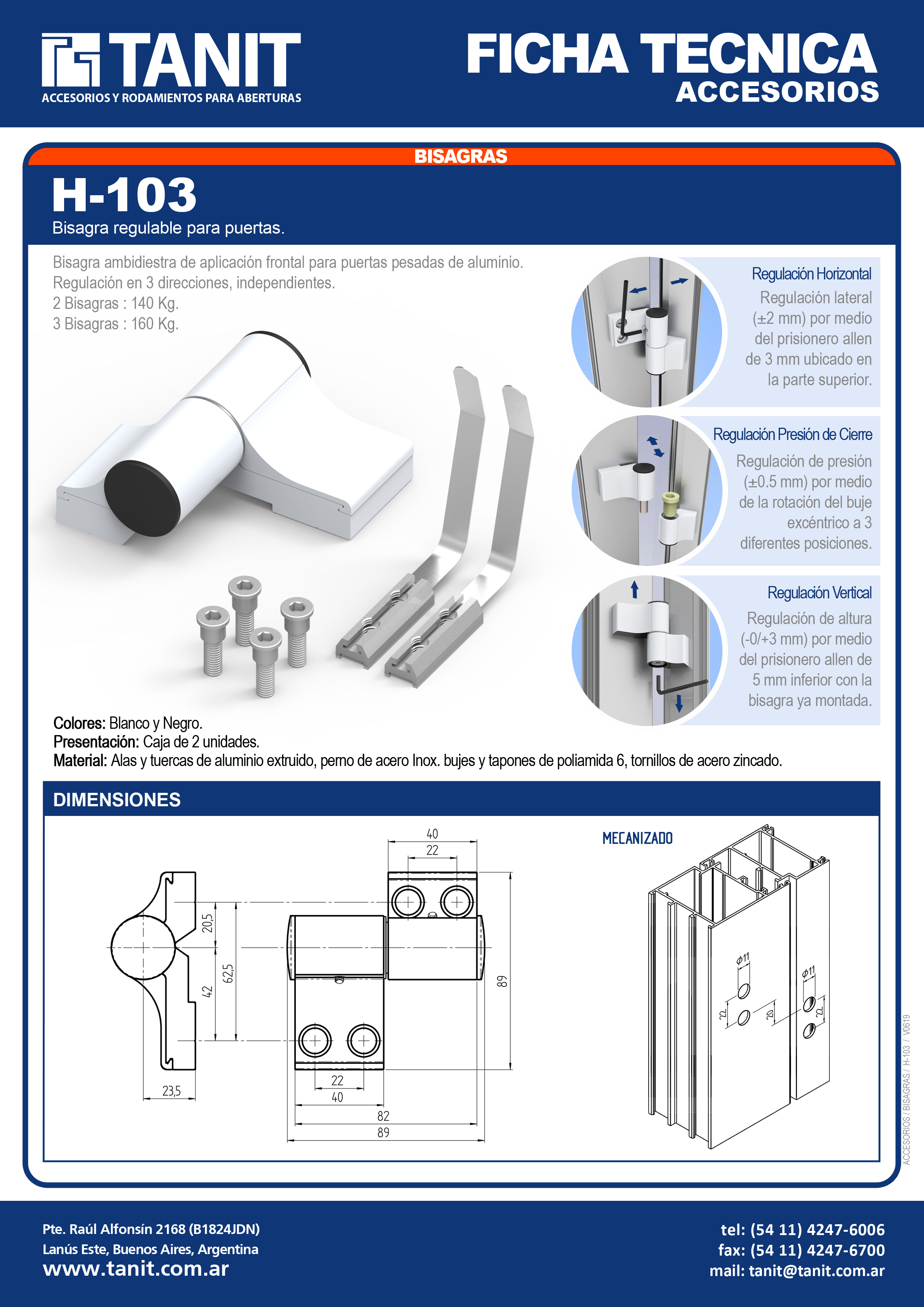 Familia: Bisagras Extrusora: Línea: Tipo: Perfil: H-103 Bisagra Regulable para Puertas Aplicación Presentación Descargas Videos COLORES: Blanco - NegroCANTIDAD: Caja x2 Unidades FICHA TÉCNICA H-103