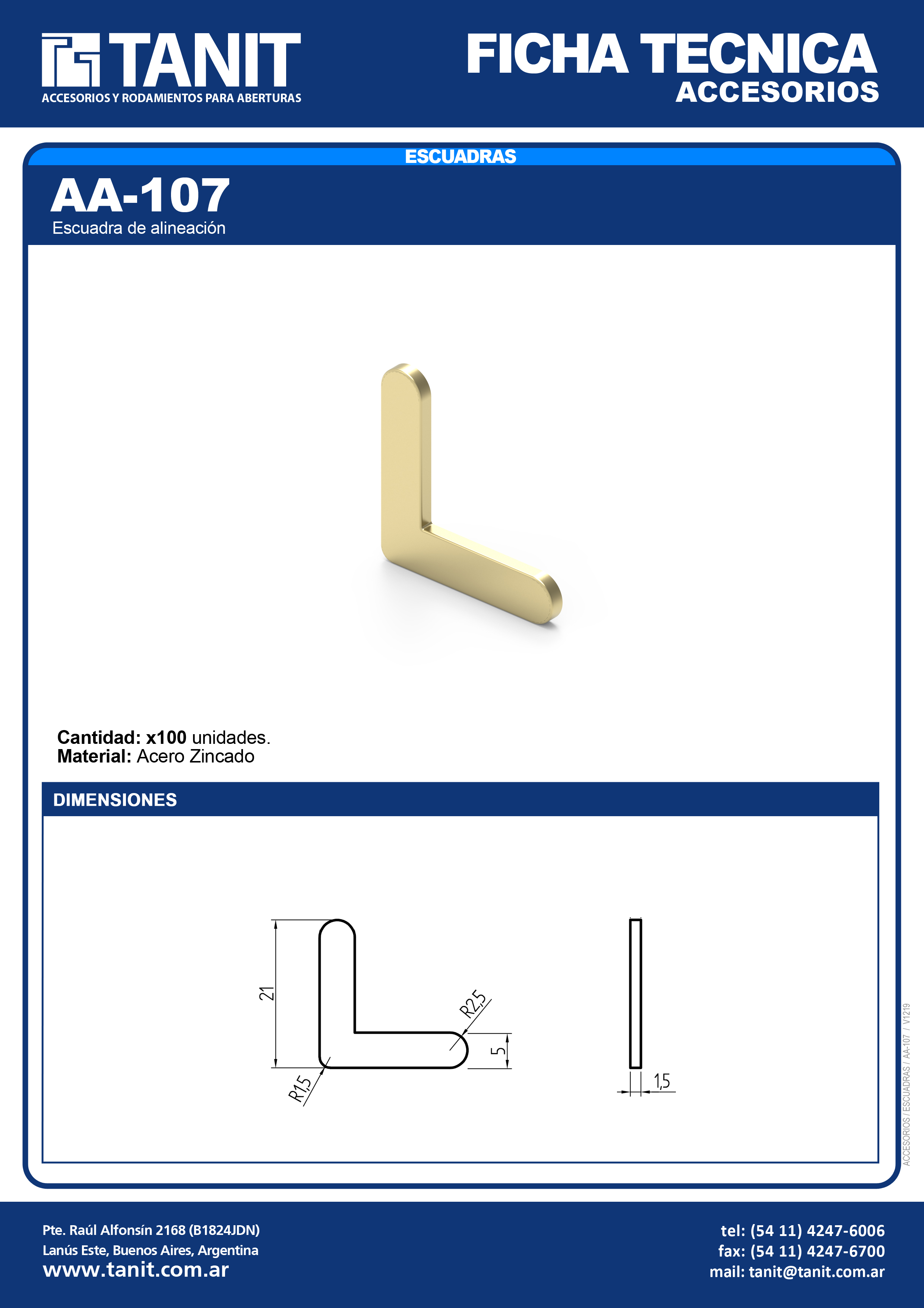 Familia: Escuadras Extrusora: HYDRO / SAPA, ALCEMAR Línea: Tipo: Perfil: AA-107 / E-CE-8020 Escuadra de alineación Aplicación Presentación Descargas Videos CANTIDAD: x100 unidades. AA-107 FICHA TECNICA