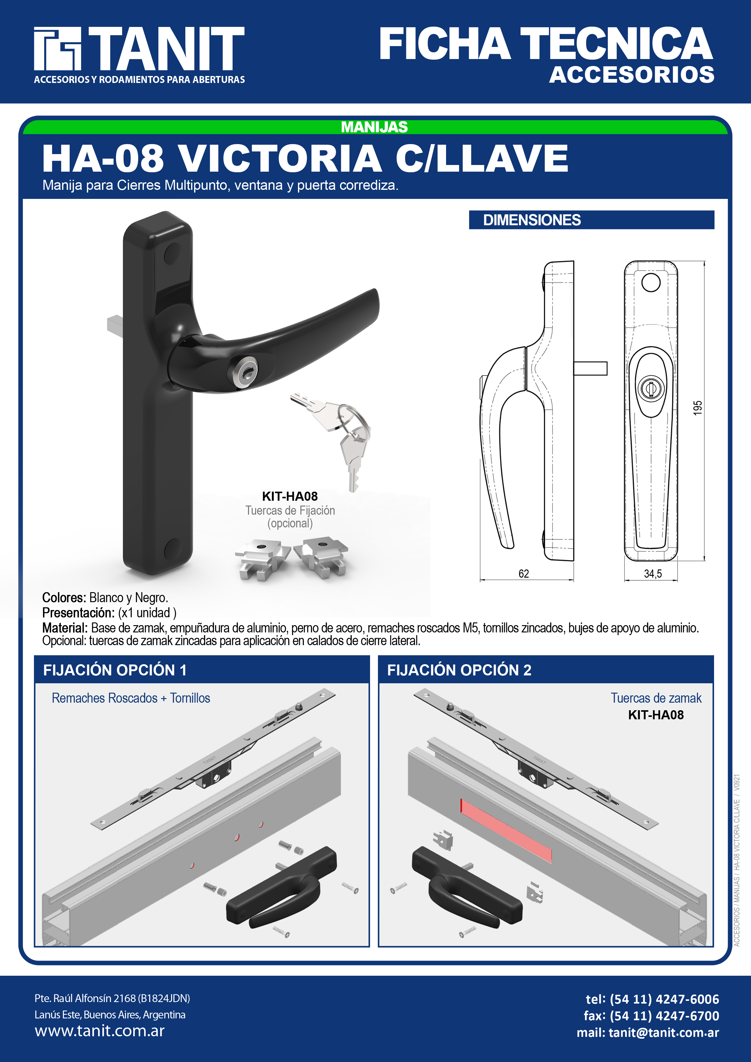 Familia: Manijas Extrusora: Línea: Tipo: Perfil: HA-08 VICTORIA C/LLAVE Manija para Cierres Multipunto, ventana y puerta corrediza. Aplicación Presentación Descargas Videos COLORES: Blanco - NegroCANTIDAD: x1 Unidad FICHA TECNICA HA-08 VICTORIA C/LLAVE