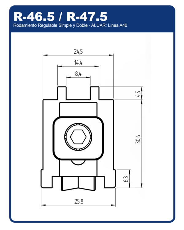 Rodamiento Doble Regulable con Rueda a Bolillas. Soporta 70 Kg. por carroPresentación: Caja x16 unidadesALUAR (A40 45º y 90º)